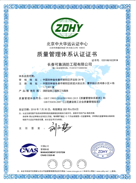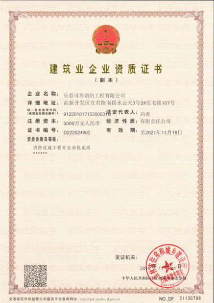 长春可靠消防工程有限公司成立于一九九九年三月五日,是在原“长春市消防工程公司”的基础上改制组建的新公司,原公司主要工程技术人员及技术工人骨干均加入了新公司。